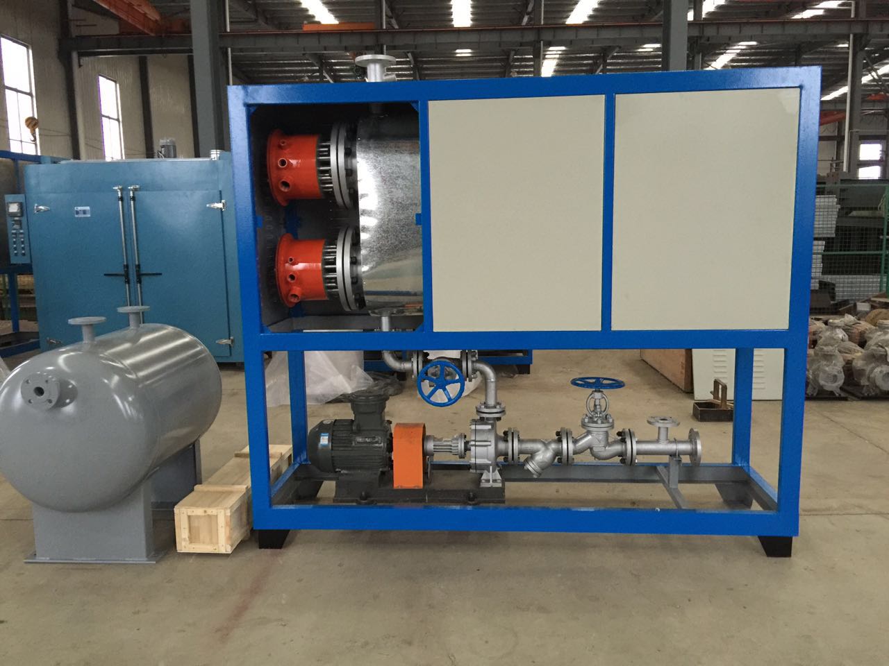 導熱油爐排氣流程: 1、導熱油通過膨脹槽注油口處加注,并通過膨脹口管道流入設(shè)備及油爐本體內(nèi),此時注油時一定要打開系統(tǒng)中所有的閥門(放油閥除外),讓導熱油流入筒體及需加熱設(shè)備內(nèi)。 2、當液面顯示約為膨脹槽高度1/2時,停止注油。 3、首 行常溫排氣:接通電源,打開導熱油加熱器的進出口閥門及排氣閥(膨脹管道閥門需一直開著以及時補充油量),按動油泵啟動按鈕,油泵運行,油泵應(yīng)按箭頭指示方向正常運行,壓力表壓力顯示在規(guī)定范圍內(nèi),視聽油泵運行情況,如有異常現(xiàn)象應(yīng)立即停機檢查,將故障排除后再重新起動油泵,進行常溫下排氣,直至壓力表指示穩(wěn)定。進行常溫排氣時,要注意觀察膨脹槽內(nèi)的液位,當?shù)陀谝?guī)定的液位高度時要及時進行補充。 4、升溫脫水:在確認常溫下運行正常后,即可進行升溫脫水排氣(操作前詳閱導熱油使用說明書及溫控儀使用說明書),升溫脫水排氣可按如下步驟進行: 步:升溫至100-120℃保溫 開始升溫時,應(yīng)該控制升溫速度在50℃/h以內(nèi),并且監(jiān)視壓力表顯示是否正常,如發(fā)現(xiàn)無壓力或壓力不穩(wěn),說明系統(tǒng)內(nèi)仍有殘留氣體,此時要求按3要求重復進行常溫排氣操作,待系統(tǒng)壓力穩(wěn)定后方可繼續(xù),升溫至120℃后進行長時間保溫,保溫時間的長短與系統(tǒng)總?cè)萘考皩嵊偷馁|(zhì)量有關(guān)。  第二步:升溫至150-180℃保溫。  排除油中輕組分、揮發(fā)物及殘余水分,請參照KRD系列導熱油加熱器系統(tǒng)脫水排氣曲線圖操作 第三步:脫水排氣完成后要關(guān)閉排氣閥(其它閥門無需關(guān)閉),投入正常升溫運行。 5、 升溫脫水排氣過程有關(guān)事項。 升溫過程中管路可能會發(fā)出碰擊的響聲,說明系統(tǒng)內(nèi)有大量氣體或管道不暢,此時要降低升溫速度,待氣體排除便可消除聲響;如系管道不暢所至應(yīng)予以排除。 脫水排氣過程可能會有大量氣體涌入膨脹槽,造成槽內(nèi)導熱油外溢,操作前要在溢油管下安置好溢油容器。 進行脫水排氣時,現(xiàn)場必須有人員看守,發(fā)現(xiàn)異常及時處理。   對于所提的油泵無油或少許油流出的問題,解決方案如下: 1、 關(guān)閉出油口閥門,啟動油泵,觀察壓力表顯示情況,若無壓力,則說明回油口無油補充油泵,使得油泵空轉(zhuǎn),無后續(xù)油及時補充,則請貴司檢查一下回油口的供油情況,此時請確保膨脹槽里有油并膨脹管道閥門打開和需熱設(shè)備有油并出油口閥門在打開狀態(tài)。 2、 如果以上要求都執(zhí)行到位,壓力表還無壓力,請檢查油爐上的油泵、截止閥及過濾器是否堵塞。 3、 若壓力表顯示壓力值,而油泵、截止閥及過濾器并無堵塞,那油爐的出油口一定會按油泵所提供的流量進行流出。